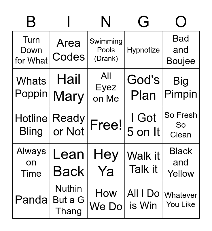 This bingo card has a free space and 24 words: Lean Back, Nuthin But a G Thang, All Eyez on Me, Panda, Bad and Boujee, Turn Down for What, Whats Poppin, Area Codes, I Got 5 on It, Hey Ya, God's Plan, Hotline Bling, Walk it Talk it, Black and Yellow, Hail Mary, All I Do is Win, So Fresh So Clean, Swimming Pools (Drank), Big Pimpin, Ready or Not, Whatever You Like, Always on Time, Hypnotize and How We Do.