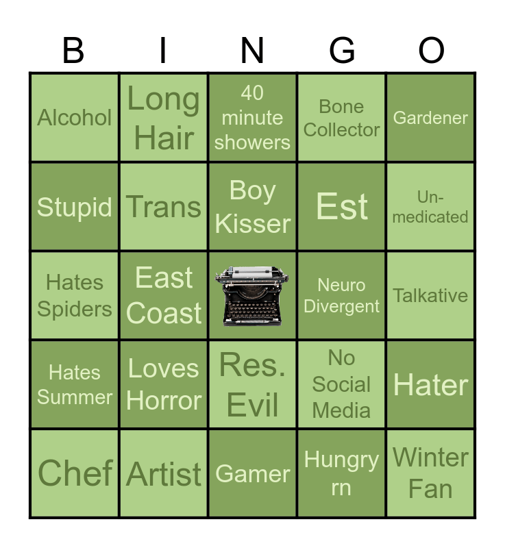 This bingo card has a free space and 24 words: Loves Horror, Artist, Boy Kisser, Chef, Gardener, Alcohol, Stupid, Long Hair, Neuro Divergent, Res. Evil, Est, Hates Spiders, No Social Media, Hater, Trans, Hungry rn, Talkative, 40 minute showers, Un-medicated, East Coast, Winter Fan, Hates Summer, Bone Collector and Gamer.