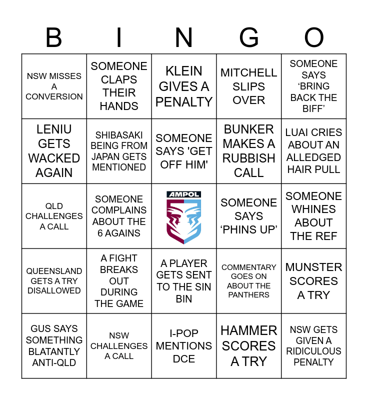 This bingo card has a free space and 29 words: GUS SAYS SOMETHING BLATANTLY ANTI-QLD, QUEENSLAND SCORES A TRY, SOMEONE COMPLAINS ABOUT THE 6 AGAINS, THE STUPID TELSTRA AD IS PLAYED, NSW MISSES A CONVERSION, KLEIN GIVES A PENALTY, SHIBASAKI BEING FROM JAPAN GETS MENTIONED, A FIGHT BREAKS OUT DURING THE GAME, SOMEONE SAYS ‘PHINS UP’, NSW CHALLENGES A CALL, SOMEONE WHINES ABOUT THE REF, NSW GETS GIVEN A RIDICULOUS PENALTY, I-POP MENTIONS DCE, HAMMER SCORES A TRY, LUAI CRIES ABOUT AN ALLEDGED HAIR PULL, COATES SCORES A CORNER POST TRY, A PLAYER GETS SENT TO THE SIN BIN, QUEENSLAND GETS A TRY DISALLOWED, SOMEONE SAYS ‘BRING BACK THE BIFF’, QLD CHALLENGES A CALL, COMMENTARY GOES ON ABOUT THE PANTHERS, NSW MAKE A 40/20 ATTEMPT, BUNKER MAKES A RUBBISH CALL, LENIU GETS WACKED AGAIN, MITCHELL SLIPS OVER, SOMEONE CLAPS THEIR HANDS, MUNSTER SCORES A TRY, SOMEONE SAYS 'GET OFF HIM' and DEARDEN MAKES A LINE BREAK.