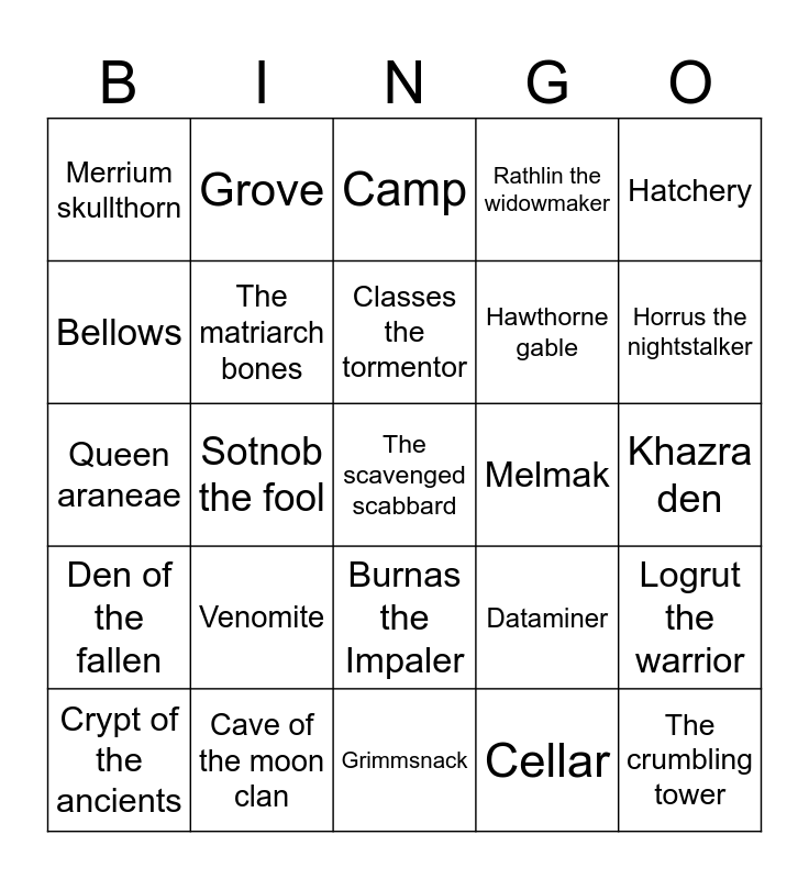 This bingo card has 25 words: Venomite, Grimmsnack, Classes the tormentor, Crypt of the ancients, Hatchery, Merrium skullthorn, Bellows, Grove, Melmak, Burnas the Impaler, Hawthorne gable, Queen araneae, Dataminer, Logrut the warrior, The matriarch bones, The crumbling tower, Khazra den, Camp, Horrus the nightstalker, Sotnob the fool, The scavenged scabbard, Cave of the moon clan, Den of the fallen, Rathlin the widowmaker and Cellar.