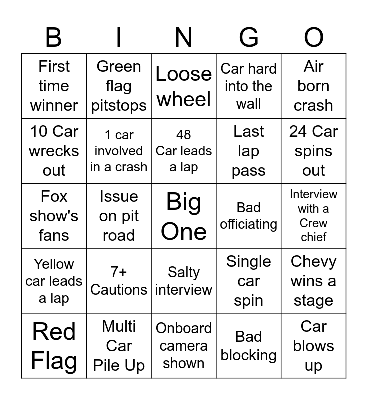 This bingo card has a free space and 24 words: 7+ Cautions, Multi Car Pile Up, 48 Car leads a lap, Red Flag, Air born crash, First time winner, 10 Car wrecks out, Green flag pitstops, Bad officiating, Salty interview, Last lap pass, Fox show's fans, Single car spin, Chevy wins a stage, 1 car involved in a crash, Bad blocking, Interview with a Crew chief, Loose wheel, 24 Car spins out, Issue on pit road, Car blows up, Yellow car leads a lap, Car hard into the wall and Onboard camera shown.