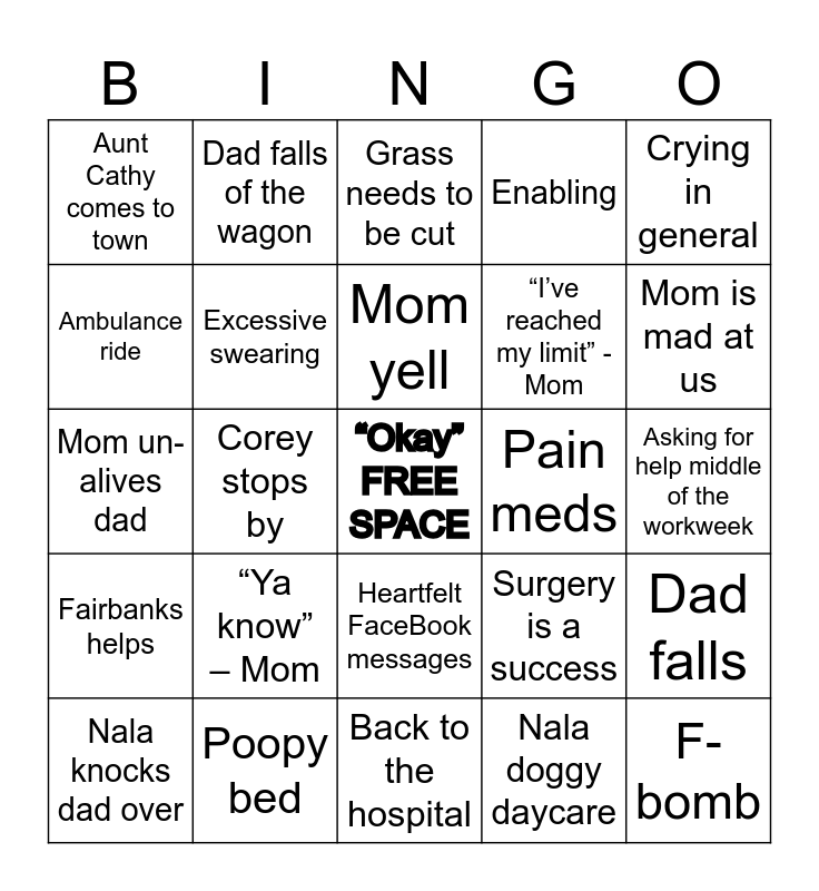 This bingo card has a free space and 24 words: “Ya know” – Mom, Poopy bed, Mom yell, Nala knocks dad over, Crying in general, Aunt Cathy comes to town, Ambulance ride, Dad falls of the wagon, Pain meds, Heartfelt FaceBook messages, “I’ve reached my limit” -Mom, Mom un-alives dad, Surgery is a success, Dad falls, Excessive swearing, Nala doggy daycare, Asking for help middle of the workweek, Grass needs to be cut, Mom is mad at us, Corey stops by, F-bomb, Fairbanks helps, Enabling and Back to the hospital.