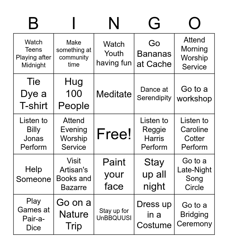This bingo card has a free space and 24 words: Visit Artisan's Books and Bazarre, Go on a Nature Trip, Meditate, Play Games at Pair-a-Dice, Attend Morning Worship Service, Watch Teens Playing after Midnight, Tie Dye a T-shirt, Make something at community time, Listen to Reggie Harris Perform, Paint your face, Dance at Serendipity, Listen to Billy Jonas Perform, Stay up all night, Go to a Late-Night Song Circle, Hug 100 People, Dress up in a Costume, Listen to Caroline Cotter Perform, Watch Youth having fun, Go to a workshop, Attend Evening Worship Service, Go to a Bridging Ceremony, Help Someone, Go Bananas at Cache and Stay up for UnBBQUUSI.