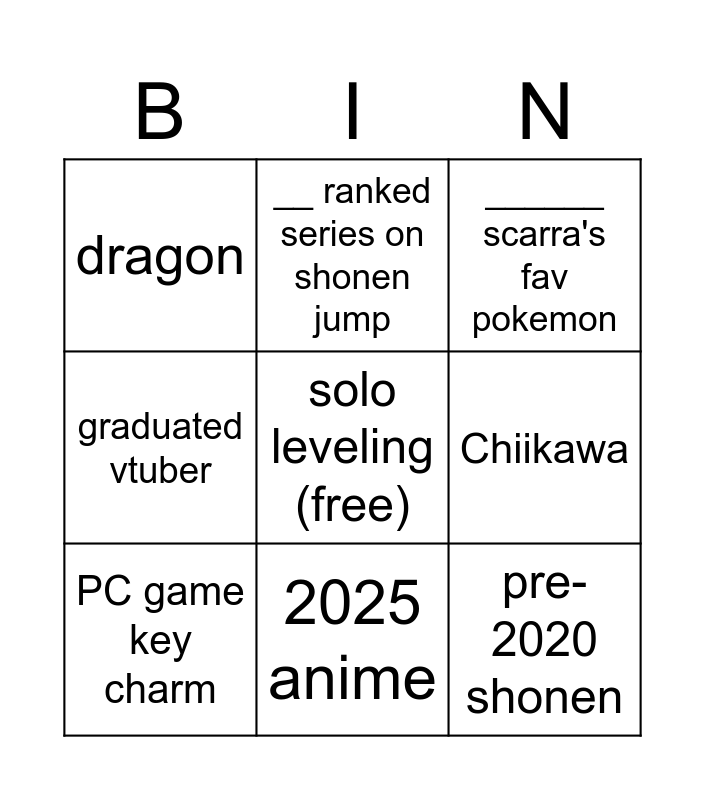 This bingo card has a free space and 8 words: Chiikawa, ______ scarra's fav pokemon, __ ranked series on shonen jump, PC game key charm, dragon, pre-2020 shonen, graduated vtuber and 2025 anime.