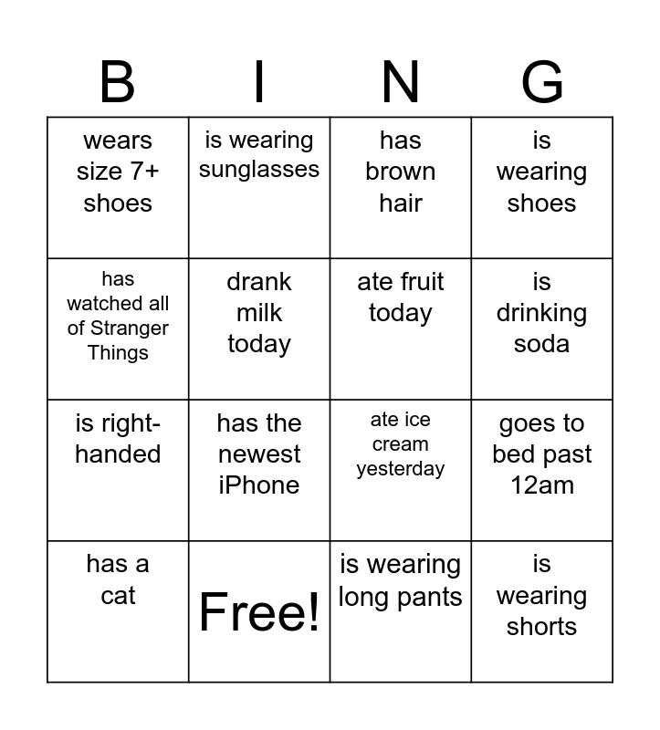 This bingo card has 28 words: has a name (first/last) starting with K, is wearing red, white, & blue, is right-handed, loves fries, drank milk today, has brown hair, is wearing sunglasses, is wearing shorts, Free!, drove here today, ate ice cream yesterday, is wearing shoes, is wearing a hat, has gone surfing, has the newest iPhone, can climb a tree, has been to Tennessee, ate fruit today, is drinking soda, has been outside the country, wears size 7+ shoes, has been to Kings Island, has a cat, goes to bed past 12am, is wearing long pants, can speak more than one language, has watched all of Stranger Things and has been to a concert.