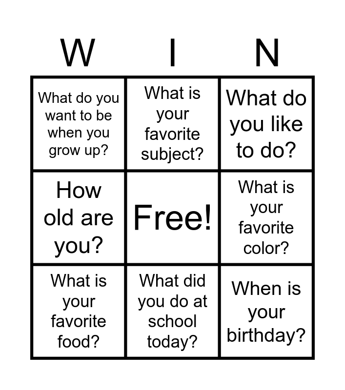 This bingo card has a free space and 9 words: What is your favorite food?, What do you like to do?, What is your favorite subject?, How old are you?, What do you want to be when you grow up?, What is your favorite color?, When is your birthday?, What is your favorite animal? and What did you do at school today?.