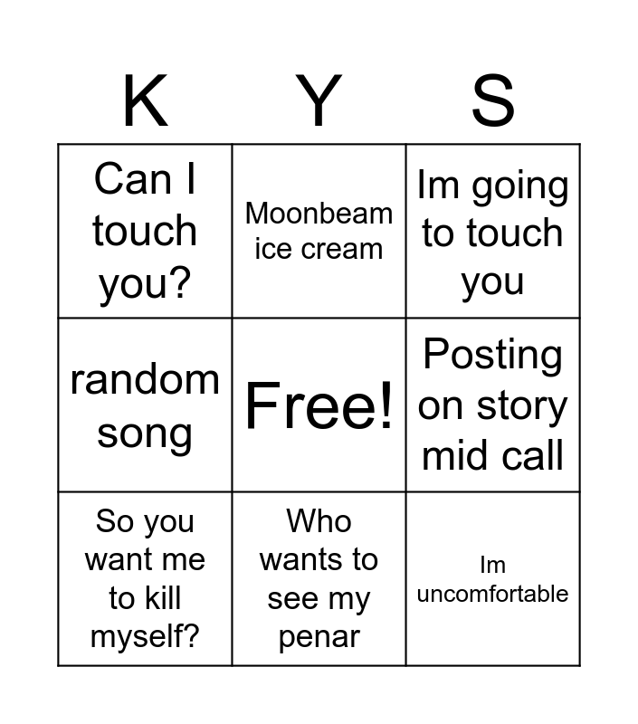 This bingo card has a free space and 8 words: Posting on story mid call, Im going to touch you, Moonbeam ice cream, So you want me to kill myself?, Can I touch you?, Im uncomfortable, random song and Who wants to see my penar.