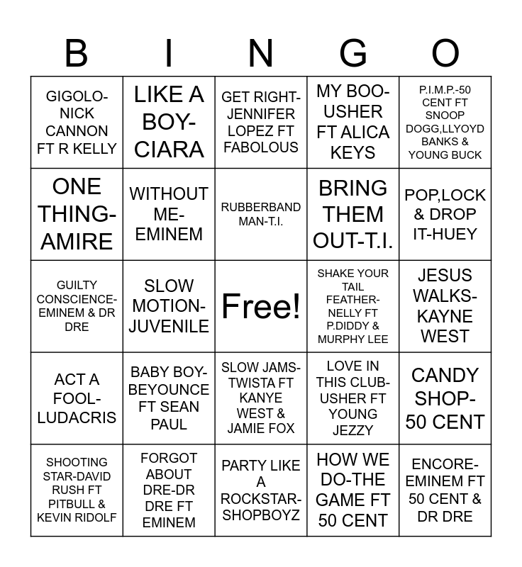 This bingo card has a free space and 40 words: MY NAME IS-EMINEM, GUILTY CONSCIENCE-EMINEM & DR DRE, THE REAL SLIM SHADY-EMINEM, WITHOUT ME-EMINEM, FORGOT ABOUT DRE-DR DRE FT EMINEM, SLOW JAMS-TWISTA FT KANYE WEST & JAMIE FOX, RUBBERBAND MAN-T.I., THROUGH THE WIRE-KANYE WEST, P.I.M.P.-50 CENT FT SNOOP DOGG,LLYOYD BANKS & YOUNG BUCK, ACT A FOOL-LUDACRIS, SLOW MOTION-JUVENILE, MY BOO-USHER FT ALICA KEYS, ENCORE-EMINEM FT 50 CENT & DR DRE, JESUS WALKS-KAYNE WEST, SHAKE YOUR TAIL FEATHER-NELLY FT P.DIDDY & MURPHY LEE, BABY BOY-BEYOUNCE FT SEAN PAUL, ALL FALLS DOWN-KANYE WEST, GIGOLO-NICK CANNON FT R KELLY, DISCO INFERNO-50 CENT, GET RIGHT-JENNIFER LOPEZ FT FABOLOUS, CANDY SHOP-50 CENT, HOW WE DO-THE GAME FT 50 CENT, BRING THEM OUT-T.I., ONE THING-AMIRE, RUN IT (REMIX)-CHRIS BROWN, TURN ME ON-KEVIN LITTLE, ROSES-OUTKAST, TEMPERATURE-SEAN PAUL, SHAKE IT OFF-MARIAH CAREY, LETS GO-TRICK DADDY FT TWISTA & LIL JON, OVERNIGHT CELEBRITY-TWISTA, SHOOTING STAR-DAVID RUSH FT PITBULL & KEVIN RIDOLF, AMERICAN BOY-ESTELLE FT KANYE WEST, LOVE IN THIS CLUB-USHER FT YOUNG JEZZY, POP,LOCK & DROP IT-HUEY, PARTY LIKE A ROCKSTAR-SHOPBOYZ, LIPGLOSS-LIL MAMA, THE SWEET ESCAPE-GWEN STEFANI FT AKON, LIKE A BOY-CIARA and LEAN WIT IT, ROCK WIT IT-DEM FRANCHISE BOYS.
