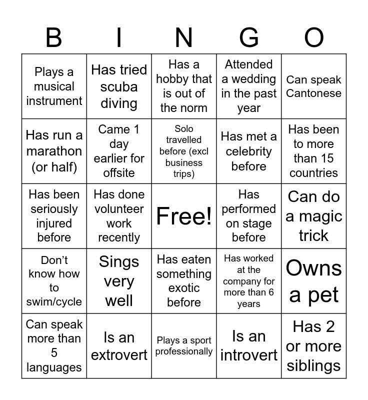 This bingo card has a free space and 24 words: Sings very well, Is an extrovert, Solo travelled before (excl business trips), Can speak more than 5 languages, Can speak Cantonese, Plays a musical instrument, Has run a marathon (or half), Has tried scuba diving, Has performed on stage before, Has eaten something exotic before, Has met a celebrity before, Has been seriously injured before, Has worked at the company for more than 6 years, Owns a pet, Came 1 day earlier for offsite, Is an introvert, Can do a magic trick, Has a hobby that is out of the norm, Has been to more than 15 countries, Has done volunteer work recently, Has 2 or more siblings, Don’t know how to swim/cycle, Attended a wedding in the past year and Plays a sport professionally.
