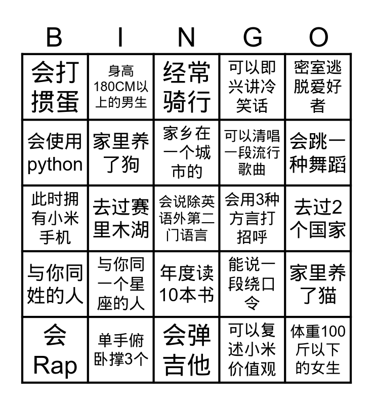 This bingo card has a free space and 24 words: 与你同一个星座的人, 单手俯卧撑3个, 家乡在一个城市的, 会Rap, 密室逃脱爱好者, 会打掼蛋, 会使用python, 身高180CM以上的男生, 会用3种方言打招呼, 年度读10本书, 可以清唱一段流行歌曲, 此时拥有小米手机, 能说一段绕口令, 家里养了猫, 家里养了狗, 可以复述小米价值观, 去过2个国家, 经常骑行, 会跳一种舞蹈, 去过赛里木湖, 体重100斤以下的女生, 与你同姓的人, 可以即兴讲冷笑话 and 会弹吉他.