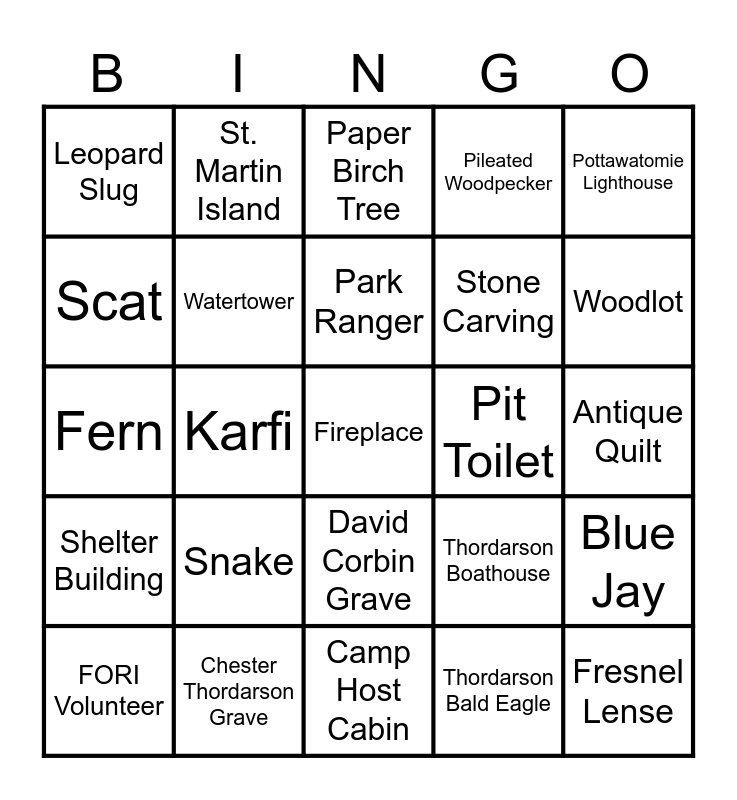 This bingo card has 25 words: Snake, Camp Host Cabin, Park Ranger, FORI Volunteer, Pottawatomie Lighthouse, Leopard Slug, Scat, St. Martin Island, Pit Toilet, David Corbin Grave, Stone Carving, Fern, Thordarson Boathouse, Blue Jay, Watertower, Fresnel Lense, Antique Quilt, Paper Birch Tree, Woodlot, Karfi, Fireplace, Chester Thordarson Grave, Shelter Building, Pileated Woodpecker and Thordarson Bald Eagle.