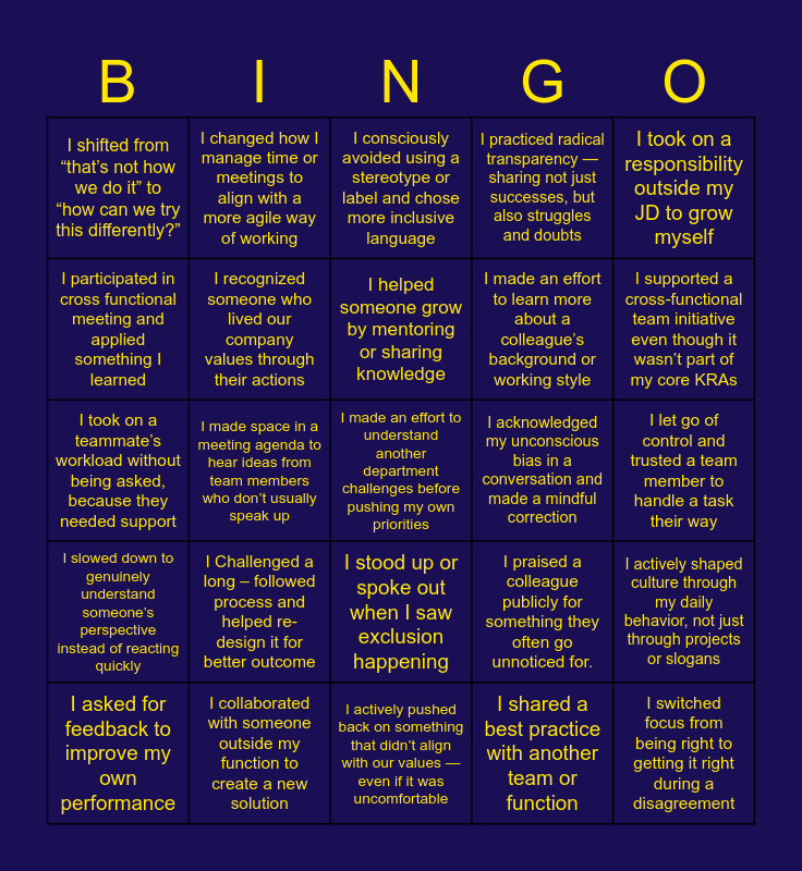 This bingo card has a free space and 24 words: I Challenged a long – followed process and helped re-design it for better outcome, I collaborated with someone outside my function to create a new solution, I helped someone grow by mentoring or sharing knowledge, I asked for feedback to improve my own performance, I took on a responsibility outside my JD to grow myself, I shifted from “that’s not how we do it” to “how can we try this differently?”, I participated in cross functional meeting and applied something I learned, I changed how I manage time or meetings to align with a more agile way of working, I acknowledged my unconscious bias in a conversation and made a mindful correction, I stood up or spoke out when I saw exclusion happening, I made an effort to learn more about a colleague’s background or working style, I took on a teammate’s workload without being asked, because they needed support, I praised a colleague publicly for something they often go unnoticed for., I actively shaped culture through my daily behavior, not just through projects or slogans, I recognized someone who lived our company values through their actions, I shared a best practice with another team or function, I let go of control and trusted a team member to handle a task their way, I consciously avoided using a stereotype or label and chose more inclusive language, I supported a cross-functional team initiative even though it wasn’t part of my core KRAs, I made space in a meeting agenda to hear ideas from team members who don’t usually speak up, I switched focus from being right to getting it right during a disagreement, I slowed down to genuinely understand someone’s perspective instead of reacting quickly, I practiced radical transparency — sharing not just successes, but also struggles and doubts and I actively pushed back on something that didn’t align with our values — even if it was uncomfortable.