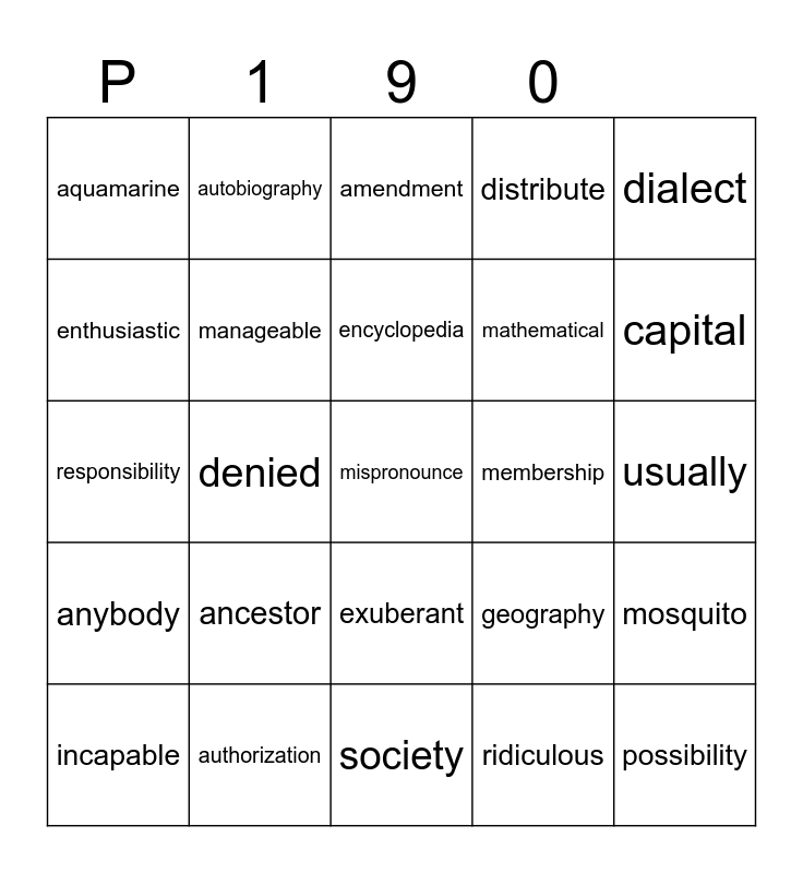 This bingo card has a free space and 24 words: ancestor, authorization, encyclopedia, incapable, dialect, aquamarine, enthusiastic, autobiography, membership, exuberant, mathematical, responsibility, geography, mosquito, manageable, ridiculous, usually, amendment, capital, denied, possibility, anybody, distribute and society.