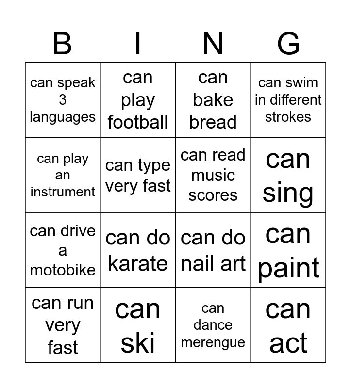 This bingo card has 16 words: can ski, can paint, can bake bread, can speak 3 languages, can drive a motobike, can play football, can do nail art, can dance merengue, can play an instrument, can type very fast, can run very fast, can swim in different strokes, can do karate, can sing, can read music scores and can act.