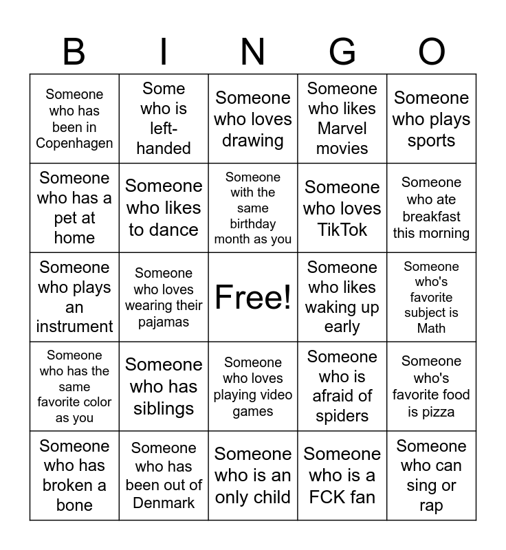 This bingo card has a free space and 24 words: Someone who has siblings, Someone who has been out of Denmark, Someone with the same birthday month as you, Someone who has broken a bone, Someone who plays sports, Someone who has been in Copenhagen, Someone who has a pet at home, Some who is left-handed, Someone who likes waking up early, Someone who loves playing video games, Someone who loves TikTok, Someone who plays an instrument, Someone who is afraid of spiders, Someone who's favorite food is pizza, Someone who likes to dance, Someone who is a FCK fan, Someone who's favorite subject is Math, Someone who loves drawing, Someone who ate breakfast this morning, Someone who loves wearing their pajamas, Someone who can sing or rap, Someone who has the same favorite color as you, Someone who likes Marvel movies and Someone who is an only child.