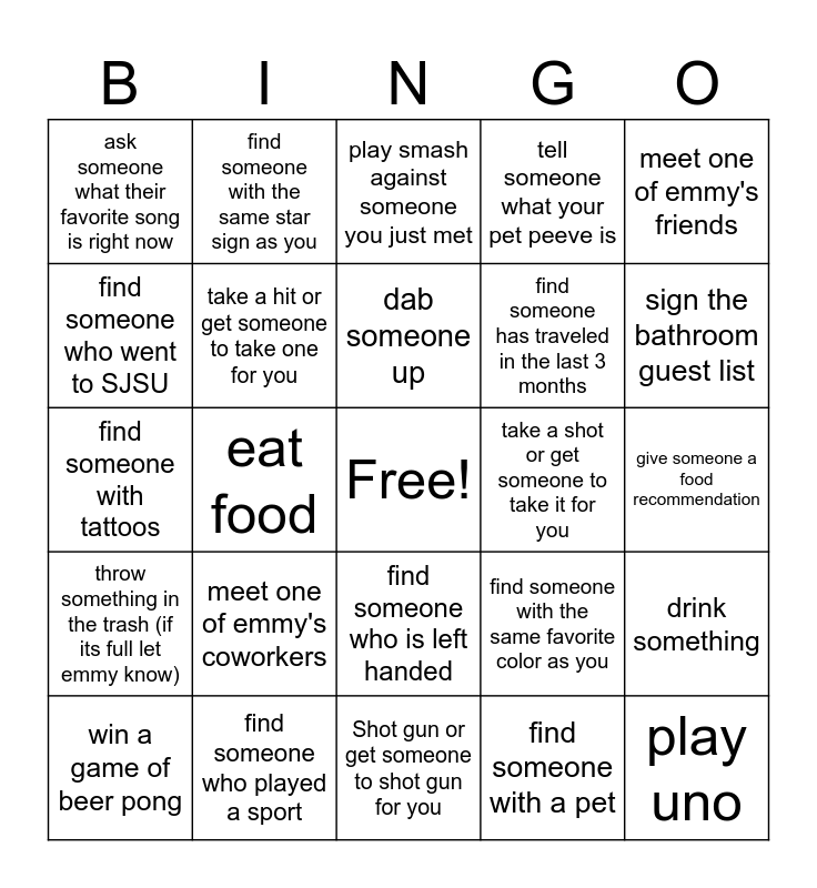 This bingo card has a free space and 24 words: meet one of emmy's coworkers, find someone who played a sport, dab someone up, win a game of beer pong, meet one of emmy's friends, ask someone what their favorite song is right now, find someone who went to SJSU, find someone with the same star sign as you, take a shot or get someone to take it for you, find someone who is left handed, find someone has traveled in the last 3 months, find someone with tattoos, find someone with the same favorite color as you, drink something, take a hit or get someone to take one for you, find someone with a pet, give someone a food recommendation, play smash against someone you just met, sign the bathroom guest list, eat food, play uno, throw something in the trash (if its full let emmy know), tell someone what your pet peeve is and Shot gun or get someone to shot gun for you.