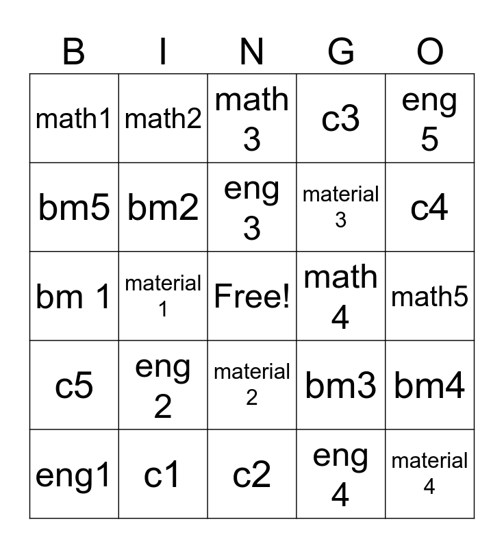 This bingo card has a free space and 24 words: eng1, eng 2, eng 3, eng 4, eng 5, math1, math2, math 3, math 4, math5, bm 1, bm2, bm3, bm4, bm5, c1, c2, c3, c4, c5, material 1, material 2, material 3 and material 4.