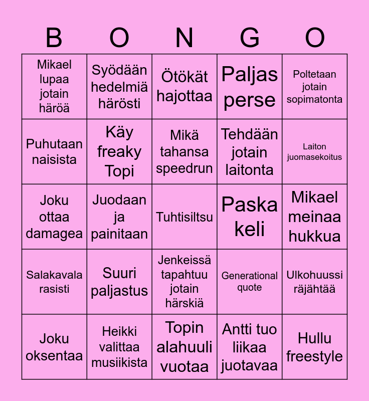 This bingo card has a free space and 24 words: Suuri paljastus, Heikki valittaa musiikista, Mikä tahansa speedrun, Joku oksentaa, Poltetaan jotain sopimatonta, Mikael lupaa jotain häröä, Puhutaan naisista, Syödään hedelmiä härösti, Paska keli, Jenkeissä tapahtuu jotain härskiä, Tehdään jotain laitonta, Joku ottaa damagea, Generational quote, Ulkohuussi räjähtää, Käy freaky Topi, Antti tuo liikaa juotavaa, Mikael meinaa hukkua, Ötökät hajottaa, Laiton juomasekoitus, Juodaan ja painitaan, Hullu freestyle, Salakavala rasisti, Paljas perse and Topin alahuuli vuotaa.