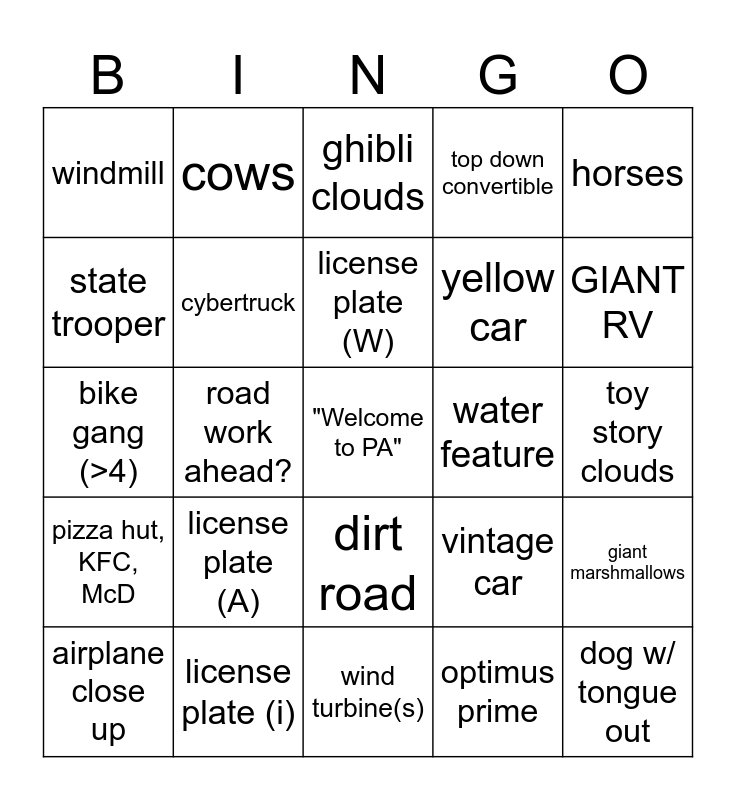 This bingo card has a free space and 24 words: license plate (A), license plate (i), license plate (W), airplane close up, horses, windmill, state trooper, cows, water feature, dirt road, yellow car, bike gang (>4), vintage car, giant marshmallows, cybertruck, optimus prime, toy story clouds, ghibli clouds, GIANT RV, road work ahead?, dog w/ tongue out, pizza hut, KFC, McD, top down convertible and wind turbine(s).