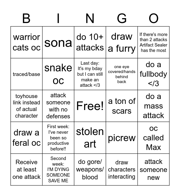 This bingo card has a free space and 24 words: First week: I've never been so productive before!!, Second week: I'M DYING SOMEONE SAVE ME, Last day: It's my bday but I can still make an attack </3, Receive at least one attack, If there's more than 2 attacks Artifact Sealer has the most, warrior cats oc, traced/base, sona, a ton of scars, stolen art, one eye covered/hands behind back, toyhouse link instead of actual character, picrew, oc called Max, snake oc, draw characters interacting, do a mass attack, do 10+ attacks, do a fullbody </3, attack someone with no defenses, attack someone new, draw a feral oc, draw a furry and do gore/ weapons/ blood.