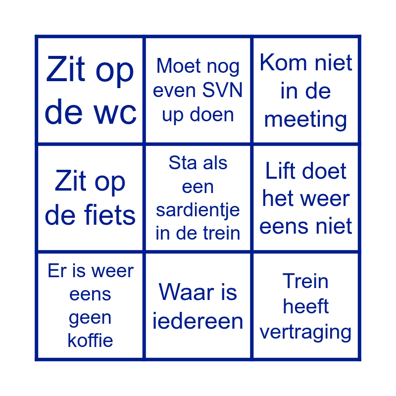 This bingo card has 11 words: Ik heb last van mijn buik, Sta als een sardientje in de trein, Trein heeft vertraging, Er is weer eens geen koffie, Moet nog even SVN up doen, Kom niet in de meeting, Zit op de fiets, Sta nog in de lift, Lift doet het weer eens niet, Zit op de wc and Waar is iedereen.