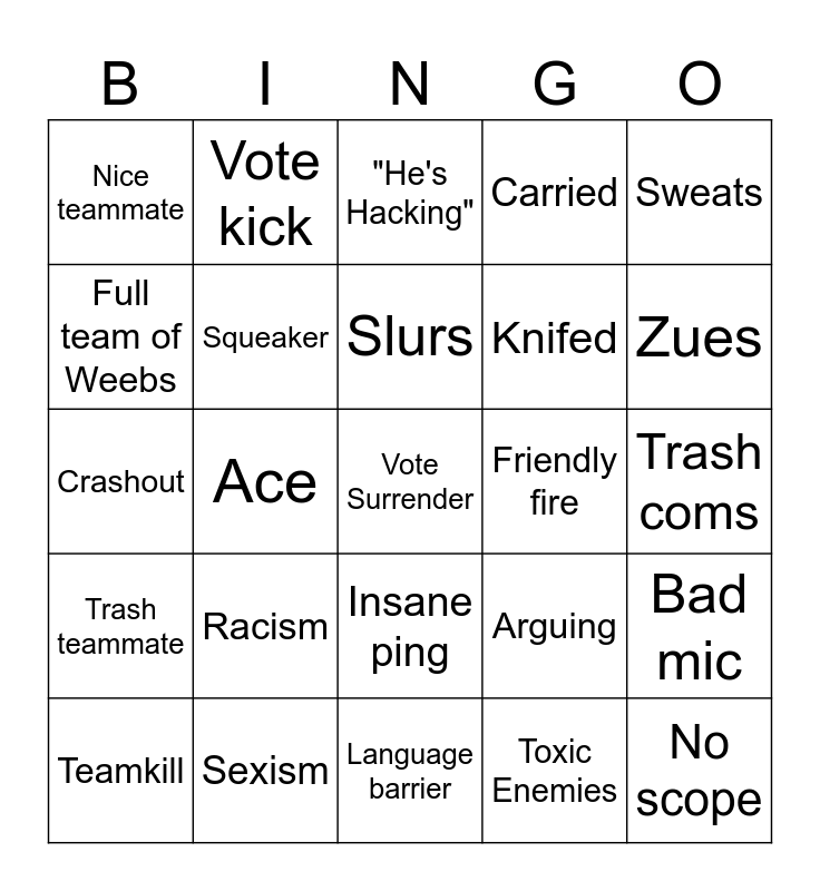 This bingo card has a free space and 24 words: Racism, Sexism, Slurs, Teamkill, Sweats, Nice teammate, Full team of Weebs, Vote kick, Friendly fire, Insane ping, Knifed, Crashout, Arguing, Bad mic, Squeaker, Toxic Enemies, Trash coms, "He's Hacking", Zues, Ace, No scope, Trash teammate, Carried and Language barrier.