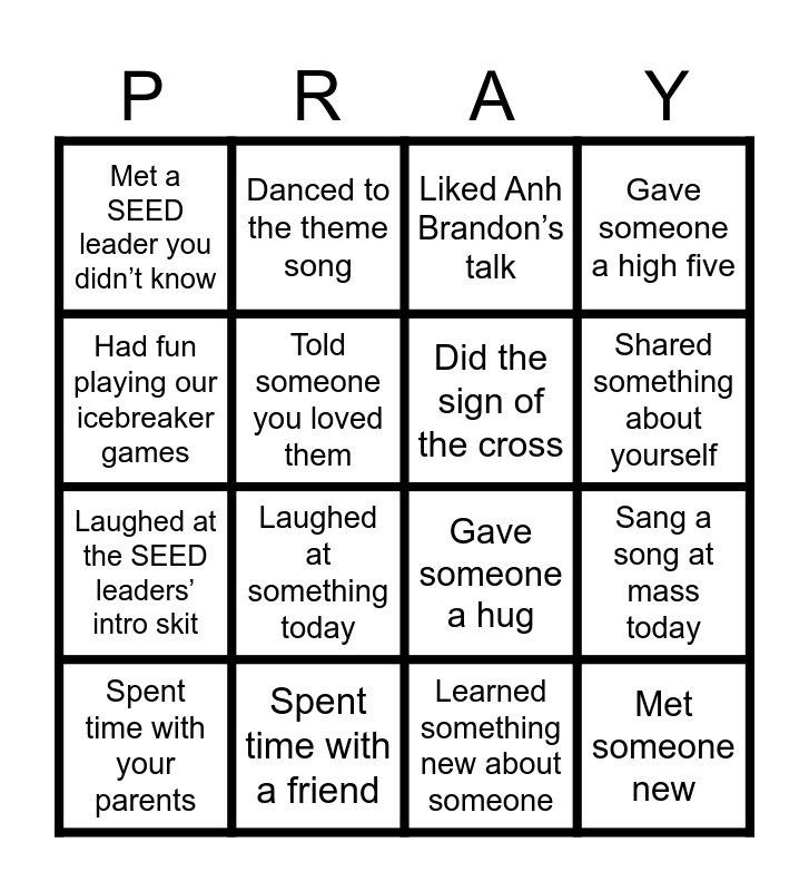 This bingo card has 19 words: Gave someone a hug, Ate something yummy, Liked Anh Brandon’s talk, Met someone new, Sang a song at mass today, Had fun playing our icebreaker games, Learned something new about someone, Met a SEED leader you didn’t know, Danced to the theme song, Laughed at the SEED leaders’ intro skit, Laughed at something today, Told someone you loved them, Did the sign of the cross, Spent time with a friend, Spent time with your parents, Said a prayer, Gave someone a high five, Shared something about yourself and Played a game.