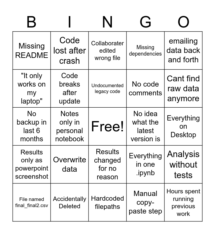 This bingo card has a free space and 24 words: Overwrite data, Accidentally Deleted, Undocumented legacy code, File named final_final2.csv, emailing data back and forth, Missing README, "It only works on my laptop", Code lost after crash, No idea what the latest version is, Results changed for no reason, No code comments, No backup in last 6 months, Everything in one .ipynb, Analysis without tests, Code breaks after update, Manual copy-paste step, Everything on Desktop, Collaborater edited wrong file, Cant find raw data anymore, Notes only in personal notebook, Hours spent running previous work, Results only as powerpoint screenshot, Missing dependencies and Hardcoded filepaths.