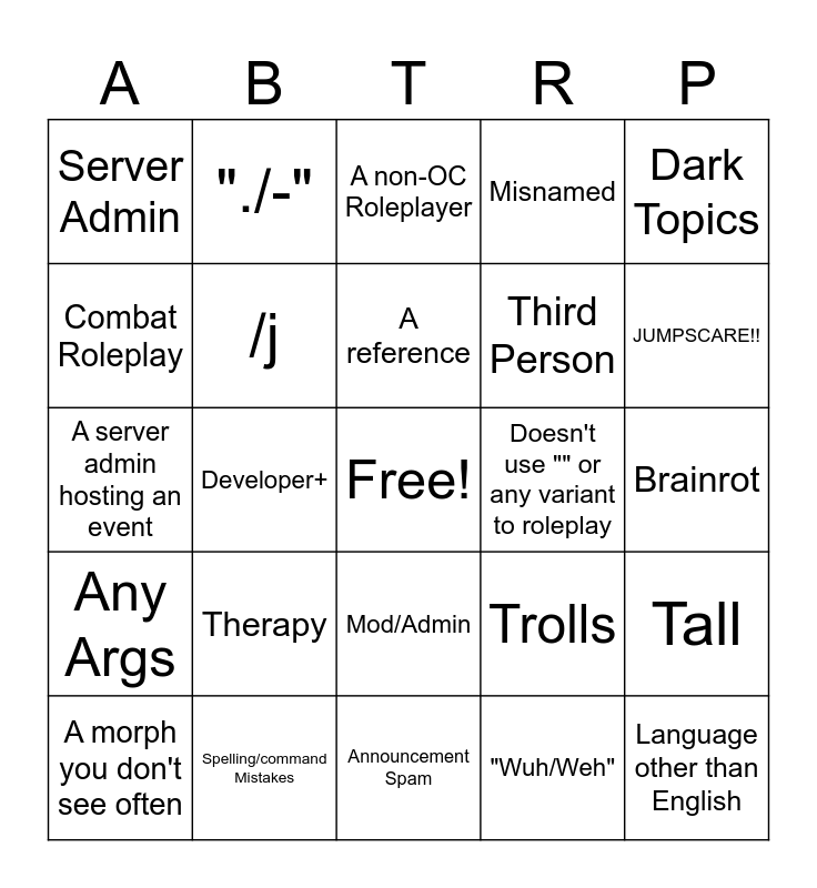 This bingo card has a free space and 69 words: () or //, Brainrot, VC, Radio, Spelling/command Mistakes, Flight, Misnamed, Begging Admins, Dark Topics, Short, Tall, YOINK!, Server Admin, A non-OC Roleplayer, Forsaken, Developer+, Mod/Admin, Third Person, First Person, Any Args, Doesn't use "" or any variant to roleplay, Trolls, JUMPSCARE!!, Serious RP Stuff, Silly Stuff, "HELP?", "HUH??", "...", "Wuh/Weh", "WHAT", "./-", "Dude/Bro", Donation in Chat, Somebody forgetting to switch IC/OOC in nametag, Glitches, Emoticons/Emojis, Anyone Playing as the Emotions, Turn-Based Fights, Combat Roleplay, Angst, Therapy, Language other than English, EVILLL moment, Rejoining, Friend Request, A morph you don't see often, ✨ Trauma ✨, Mentions of a SFOTH, Fourth Wall Break, /j, A reference, Deltarune, Voice Acting, Announcement Spam, Server Admin Abuse, Someone mistaken a server admin as a mod/etc, Morph Abuse, GODMODDER., A censored swear., A server admin hosting an event, Someone playing as a shopkeeper, Anything spooky based, Roblox Myths, Roblox Admins, Crowding, Hair Tufts, Confusion Dialogue ("???"/"...?"), Sudden Attacking and Spamming Items.