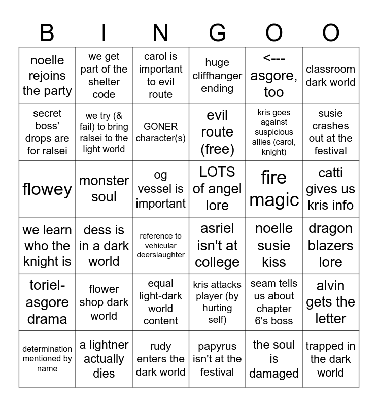 This bingo card has 36 words: kris attacks player (by hurting self), equal light-dark world content, papyrus isn't at the festival, secret boss' drops are for ralsei, we learn who the knight is, LOTS of angel lore, we try (& fail) to bring ralsei to the light world, rudy enters the dark world, <--- asgore, too, seam tells us about chapter 6's boss, susie crashes out at the festival, huge cliffhanger ending, alvin gets the letter, monster soul, evil route (free), noelle rejoins the party, toriel-asgore drama, fire magic, flowey, carol is important to evil route, og vessel is important, dess is in a dark world, asriel isn't at college, reference to vehicular deerslaughter, noelle susie kiss, we get part of the shelter code, kris goes against suspicious allies (carol, knight), a lightner actually dies, GONER character(s), classroom dark world, trapped in the dark world, determination mentioned by name, dragon blazers lore, catti gives us kris info, flower shop dark world and the soul is damaged.