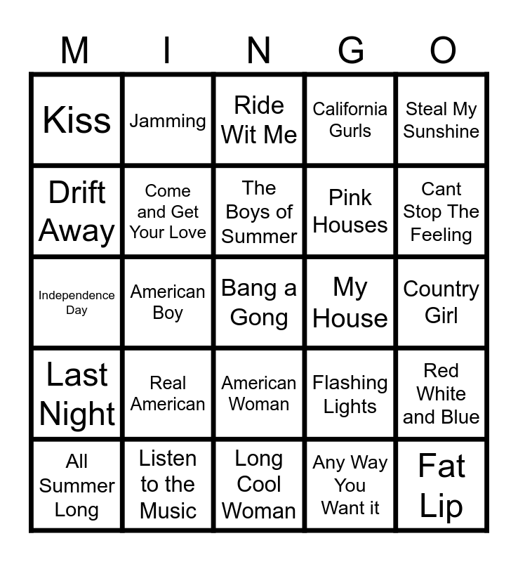This bingo card has 26 words: American Woman, Any Way You Want it, The Boys of Summer, Listen to the Music, Steal My Sunshine, Kiss, Drift Away, Jamming, Country Girl, Flashing Lights, Pink Houses, Independence Day, Red White and Blue, All Summer Long, American Boy, Your Love, California Gurls, Last Night, Ride Wit Me, Bang a Gong, Cant Stop The Feeling, Long Cool Woman, My House, Real American, Come and Get Your Love and Fat Lip.