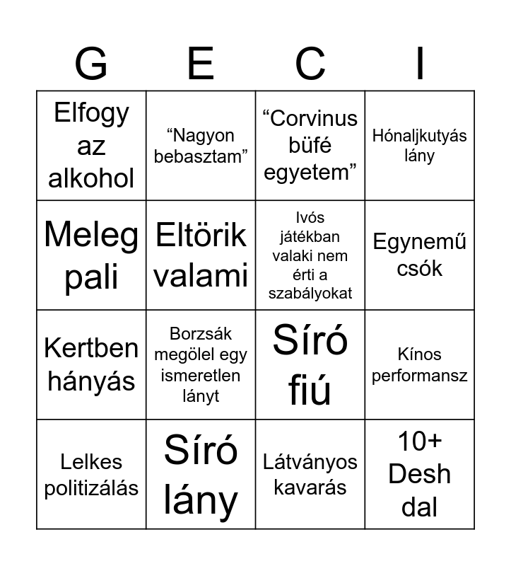 This bingo card has 16 words: Síró lány, Kínos performansz, “Corvinus büfé egyetem”, Elfogy az alkohol, Kertben hányás, “Nagyon bebasztam”, Síró fiú, Látványos kavarás, Meleg pali, Eltörik valami, Lelkes politizálás, Hónaljkutyás lány, Borzsák megölel egy ismeretlen lányt, Egynemű csók, Ivós játékban valaki nem érti a szabályokat and 10+ Desh dal.