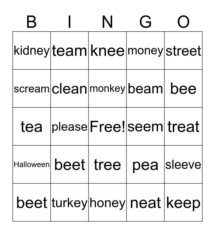 This bingo card has a free space and 24 words: beet, turkey, monkey, beet, street, kidney, scream, team, seem, tree, beam, tea, pea, sleeve, clean, neat, treat, knee, bee, please, keep, Halloween, money and honey.