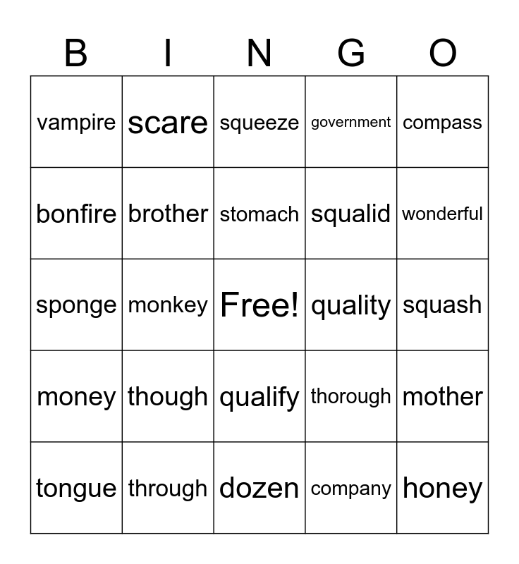This bingo card has a free space and 24 words: though, through, stomach, tongue, compass, vampire, bonfire, scare, quality, qualify, squalid, sponge, thorough, mother, brother, company, squash, squeeze, wonderful, monkey, honey, money, government and dozen.