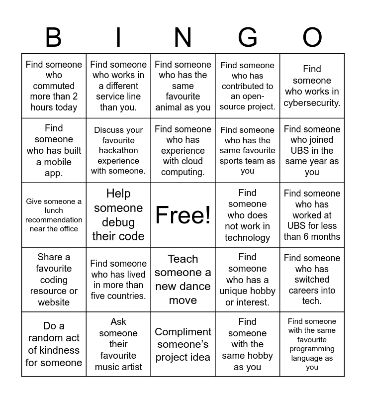 This bingo card has a free space and 51 words: Talk to someone new., Find someone with the same favourite programming language as you, Find someone who has attended more than three hackathons., Compliment someone’s project idea, Find someone who has lived in more than five countries., Teach someone a new coding trick, Find someone who works in a different service line than you., Find someone who has a pet and ask about it., Find someone who has built a mobile app., Find someone who has worked at a startup, Discuss your favourite hackathon experience with someone., Find someone who has contributed to an open-source project., Find someone who has switched careers into tech., Find someone who has a unique hobby or interest., Find someone who has used a programming language you haven't tried., Find someone who works in a different country., Find someone who has experience with cloud computing., Find someone who does not work in technology, Tell your best tech related joke, Find someone who works in cybersecurity., Help someone debug their code, Find someone with the same hobby as you, Find someone who commuted more than 2 hours today, Find someone who has the same favourite sports team as you, Share your favourite inspirational quote with someone, Find someone with the same birthday month as you, Find someone who joined UBS in the same year as you, Talk to someone who works on a different floor to you, Do a random act of kindness for someone, Find someone who has the same favourite animal as you, Find someone who has travelled to more than 8 countries, Talk to an intern, Find someone whose favourite sport is cricket, Find someone wearing red, Find someone wearing UBS merch, Ask someone their favourite music artist, Ask someone where their dream holiday destination is, Ask someone’s career goals, Find someone who has worked at more than 4 companies, Find someone who has worked at UBS for more than 5 years, Find someone who has worked at UBS for less than 6 months, Share a favourite coding resource or website, Participate in 2 other hackathon social events, Introduce yourself to someone who you’ve never spoken too, Try a new drink from the coffee machine, Spot a London landmark from a window, Give someone a lunch recommendation near the office, Find someone who works/worked in the Zurich office, Find someone who worked at Credit Suisse, Teach someone a new dance move and Find a team who has members from at least 2 different countries.