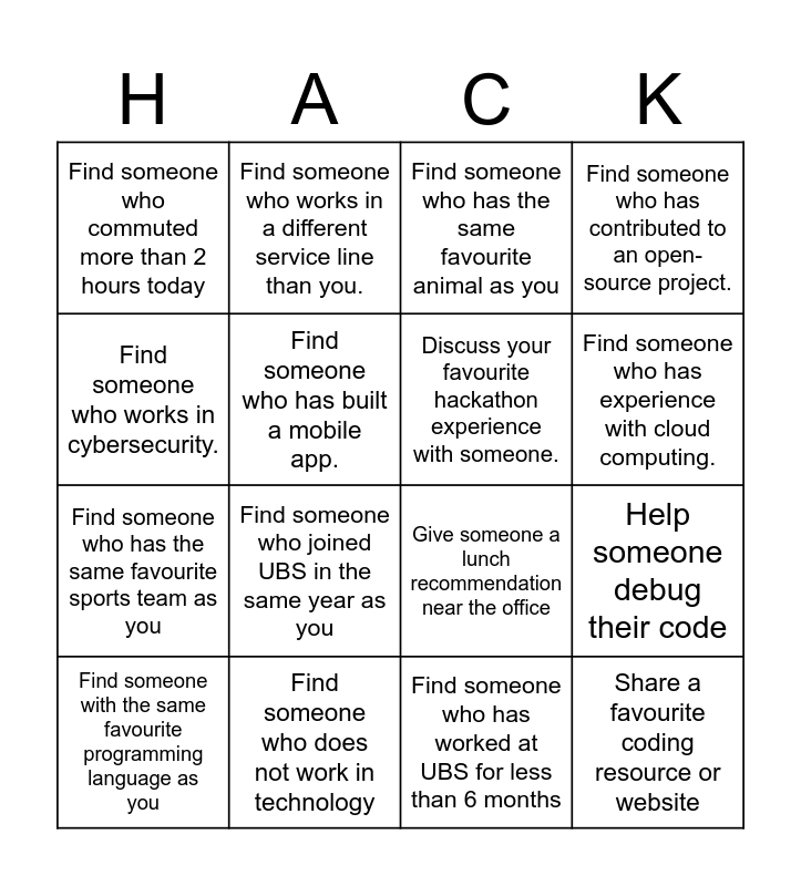 This bingo card has 51 words: Talk to someone new., Find someone with the same favourite programming language as you, Find someone who has attended more than three hackathons., Compliment someone’s project idea, Find someone who has lived in more than five countries., Teach someone a new coding trick, Find someone who works in a different service line than you., Find someone who has a pet and ask about it., Find someone who has built a mobile app., Find someone who has worked at a startup, Discuss your favourite hackathon experience with someone., Find someone who has contributed to an open-source project., Find someone who has switched careers into tech., Find someone who has a unique hobby or interest., Find someone who has used a programming language you haven't tried., Find someone who works in a different country., Find someone who has experience with cloud computing., Find someone who does not work in technology, Tell your best tech related joke, Find someone who works in cybersecurity., Help someone debug their code, Find someone with the same hobby as you, Find someone who commuted more than 2 hours today, Find someone who has the same favourite sports team as you, Share your favourite inspirational quote with someone, Find someone with the same birthday month as you, Find someone who joined UBS in the same year as you, Talk to someone who works on a different floor to you, Do a random act of kindness for someone, Find someone who has the same favourite animal as you, Find someone who has travelled to more than 8 countries, Talk to an intern, Find someone whose favourite sport is cricket, Find someone wearing red, Find someone wearing UBS merch, Ask someone their favourite music artist, Ask someone where their dream holiday destination is, Ask someone’s career goals, Find someone who has worked at more than 4 companies, Find someone who has worked at UBS for more than 5 years, Find someone who has worked at UBS for less than 6 months, Share a favourite coding resource or website, Participate in 2 other hackathon social events, Introduce yourself to someone who you’ve never spoken too, Try a new drink from the coffee machine, Spot a London landmark from a window, Give someone a lunch recommendation near the office, Find someone who works/worked in the Zurich office, Find someone who worked at Credit Suisse, Teach someone a new dance move and Find a team who has members from at least 2 different countries.
