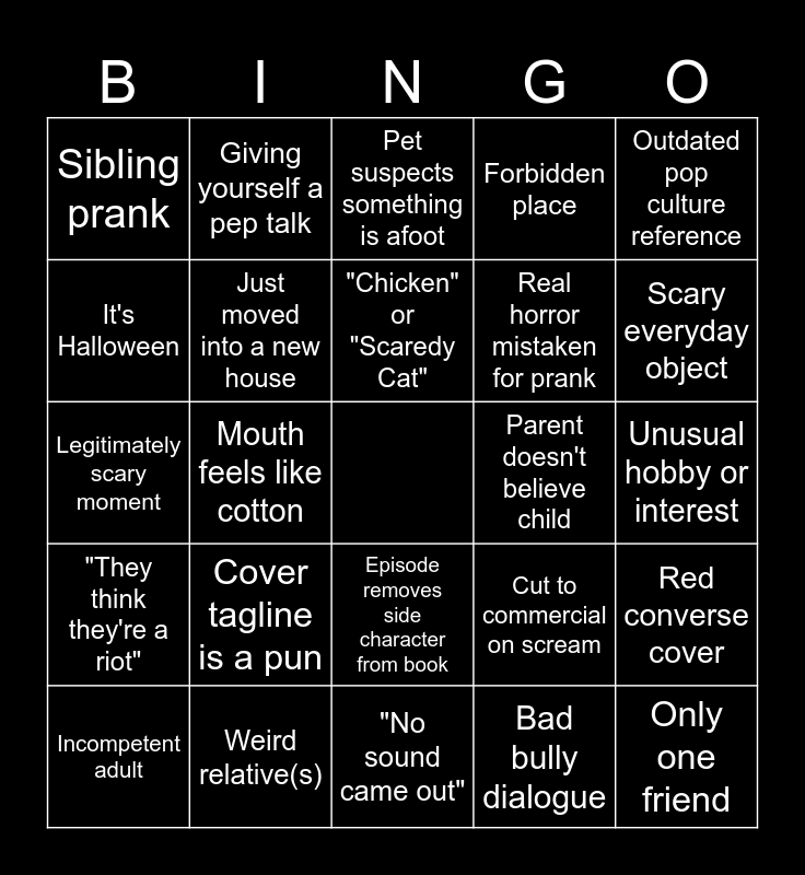 This bingo card has a free space and 31 words: "No sound came out", Arms/legs "felt like Jell-O", Mouth feels like cotton, Pet jumpscare, Sibling prank, Pet suspects something is afoot, Just moved into a new house, Cut to commercial on scream, Parent doesn't believe child, Bad bully dialogue, Unusual hobby or interest, Only one friend, It was just a dream, Antagonist has no clear motivations, Scary everyday object, Twist ending nullifies majority of plot, Red converse cover, Cover tagline is a pun, "They think they're a riot", Episode removes side character from book, Outdated pop culture reference, Chapter cliffhanger was a lie, Incompetent adult, Giving yourself a pep talk, Real horror mistaken for prank, It's Halloween, Forbidden place, Legitimately scary moment, Weird relative(s), "Chicken" or "Scaredy Cat" and Raspy voice.
