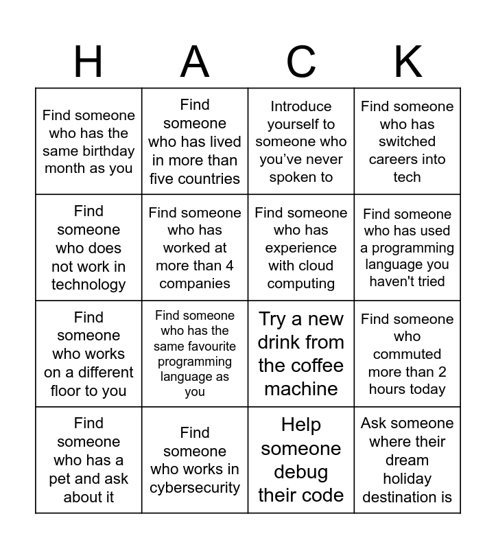 This bingo card has 47 words: Find someone who has worked at UBS for more than 5 years, Find someone who has a pet and ask about it, Find someone who has contributed to an open-source project, Find someone who has worked at UBS for less than 6 months, Find someone who has the same favourite sports team as you, Find someone who has attended more than three hackathons, Find someone who has lived in more than five countries, Find someone who has a unique hobby or interest, Find someone who has worked at more than 4 companies, Find someone who has the same favourite animal as you, Find someone who has experience with cloud computing, Find someone who has switched careers into tech, Find someone who has built a mobile app, Find someone who works in a different service line than you, Find someone who has travelled to more than 8 countries, Find someone who works in a different country, Find someone who has used a programming language you haven't tried, Find someone who works in cybersecurity, Find someone who works/worked in the Zurich office, Find someone who does not work in technology, Find someone who commuted more than 2 hours today, Find someone who joined UBS in the same year as you, Find someone who has the same birthday month as you, Find someone who works on a different floor to you, Find someone who has worked at a startup, Find someone who has the same favourite programming language as you, Find someone wearing red, Find someone wearing UBS merch, Ask someone their favourite music artist, Ask someone where their dream holiday destination is, Ask someone’s career goals, Find someone who has worked at Credit Suisse, Teach someone a new dance move, Talk to someone new, Compliment someone’s project idea, Teach someone a new coding trick, Help someone debug their code, Tell your best tech related joke, Share your favourite inspirational quote with someone, Share a favourite coding resource or website, Participate in 2 other hackathon social events, Introduce yourself to someone who you’ve never spoken to, Try a new drink from the coffee machine, Spot a London landmark from a window, Give someone a lunch recommendation near the office, Talk to an intern and Find someone whose favourite sport is cricket.