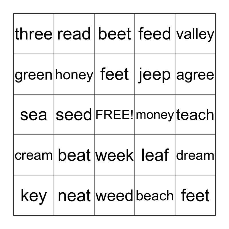 This bingo card has a free space and 24 words: beat, neat, feet, key, valley, three, green, read, money, week, jeep, sea, leaf, dream, honey, beach, teach, beet, agree, seed, feet, cream, feed and weed.