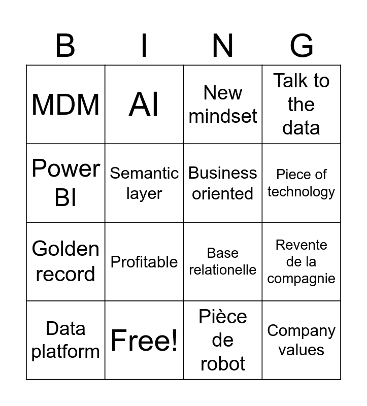 This bingo card has 16 words: Free!, Revente de la compagnie, New mindset, MDM, Golden record, AI, Base relationelle, Pièce de robot, Power BI, Semantic layer, Data platform, Talk to the data, Profitable, Piece of technology, Business oriented and Company values.