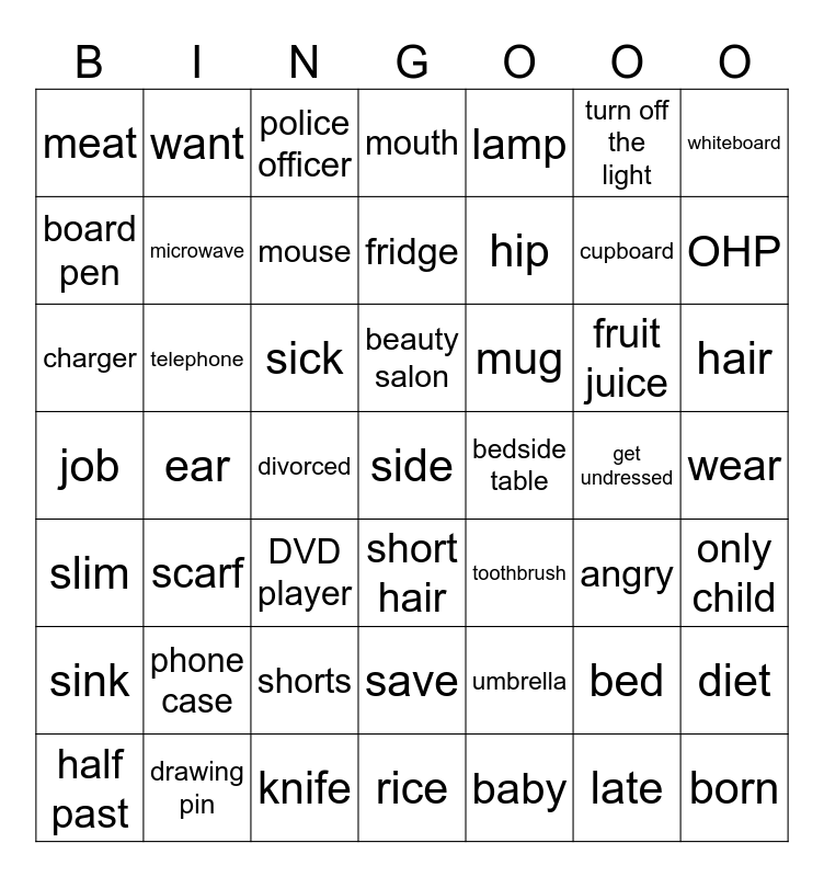 This bingo card has 406 words: bookshelf, books, light, light switch, lamp, picture, TV, hi-fi, window, curtains, sofa, table, chair, rug, carpet, socket, phone, remote control, coffee table, armchair, doctor, teacher, nurse, mechanic, secretary, shop assistant, hairdresser, engineer, farmer, police officer, traffic warden, librarian, bank clerk, waiter, restaurant, taxi driver, office, factory, shop, beauty salon, hospital, job, work, writer, English, maths, art, history, geography, biology, ICT, PE, chemistry, modern languages, physics, music, board, noticeboard, piece of paper, pencil, notebook, textbook, pencil sharpener, drawing pin, board rubber, board pen, OHP, pen, desk, whiteboard, computer, DVD player, ruler, letter, date, address, envelope, stamp, letter box, email, email address, online, screen, keyboard, mouse, laptop, memory stick, mobile device, mobile, telephone, phone box, phone number, mobile number, voicemail, text, message, camera, apps, power button, phone case, battery, SIM card, charger, selfie, download, call, PIN, swipe, save, delete, memory, locked, unlock, relatives, relations, husband, wife, father, mother, parents, son, daughter, brother, sister, siblings, grandfather, grandmother, grandparents, grandson, granddaughter, uncle, aunt, niece, nephew, cousin, only child, birth, born, birthday, baby, weigh, call, single, married, separated, divorced, widowed, wedding, bride, groom, honeymoon, die, dead, death, funeral, heart attack, hair, eye, nose, tooth, teeth, ear, mouth, lip, neck, shoulder, nail, thumb, finger, hand, arm, leg, knee, foot, feet, toe, chest, side, stomach, back, waist, hip, skin, heart, brain, blood, coat, jacket, scarf, gloves, shoes, trainers, boots, suit, hat, socks, skirt, tie, T-shirt, watch, shirt, dress, ring, belt, sweater, jumper, trousers, jeans, shorts, tights, glasses, pyjamas, sunglasses, wear, carry, get dressed, get undressed, put on, take off, bag, umbrella, tall, short, medium height, slim, overweight, fat, dark hair, blonde hair, fair hair, long hair, short hair, brown eyes, blue eyes, green eyes, dark skin, fair skin, beard, moustache, beautiful, good-looking, pretty, ugly, average-looking, old, very old, middle-aged, young, elderly, well, fine, ill, sick, doctor, dentist, aspirin, headache, toothache, cold, hay fever, sneeze, asthma, mosquito, malaria, cholera, cancer, hospital, healthy, diet, exercise, relax, love, like, don’t like, hate, happy, sad, angry, upset, cold, hot, thirsty, hungry, tired, surprised, prefer, hope, want, bread, rice, pasta, salt, pepper, meat, fish, vegetarian, sugar, tea, coffee, hamburgers, hot dogs, pizzas, fish and chips, carrots, beans, potatoes, tomatoes, peas, onions, garlic, mushrooms, apple, orange, banana, pear, grapes, strawberries, pineapple, milk, fruit juice, beer, wine, mineral water, fridge, freezer, microwave, cupboard, shelf, worktop, tap, sink, bin, washing machine, cooker, dishwasher, saucepan, frying pan, teapot, coffee maker, tea towel, kitchen roll, cloth, washing-up liquid, cup, bowl, plate, fork, knife, spoon, chopsticks, glass, mug, bed, bedside lamp, alarm clock, pyjamas, dressing table, chest of drawers, mirror, wardrobe, bedside table, comb, hairbrush, soap, toothpaste, toothbrush, shower, shampoo, shower gel, razor, toilet, basin, towel, go to bed, go upstairs, get undressed, get into bed, read, turn off the light, fall asleep, wake up, get up, have a shower, clean teeth, get dressed, go downstairs, have breakfast, today, tomorrow, yesterday, morning, afternoon, evening, night, week, weekend, day, month, year, o’clock, half past, quarter past, quarter to, early, late and on time.