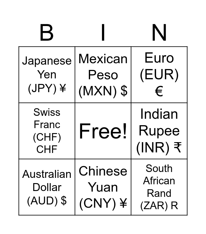 This bingo card has a free space and 17 words: US Dollar (USD): $, US Dollar (USD) $, Euro (EUR) €, Japanese Yen (JPY) ¥, British Pound Sterling (GBP) £, Swiss Franc (CHF) CHF, Canadian Dollar (CAD) $, Australian Dollar (AUD) $, Chinese Yuan (CNY) ¥, Indian Rupee (INR) ₹, Russian Ruble (RUB) ₽, Brazilian Real (BRL) R$, South African Rand (ZAR) R, Mexican Peso (MXN) $, Singapore Dollar (SGD) $, New Zealand Dollar (NZD) $ and Hong Kong Dollar (HKD) HK$.