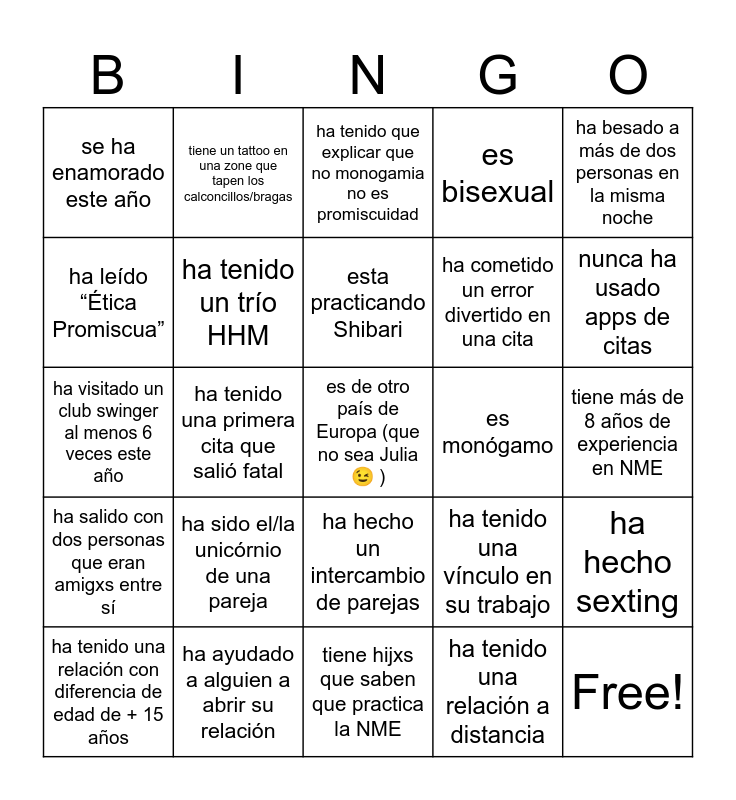 This bingo card has 34 words: Free!, ha tenido una relación a distancia, ha explicado la no monogamia a sus padres, ha hecho ghosting, ha salido con dos personas que eran amigxs entre sí, ha tenido un trío HHM, ha besado a más de dos personas en la misma noche, ha tenido una relación con diferencia de edad de + 15 años, tiene un tattoo en una zone que tapen los calconcillos/bragas, le encanta fanfiction erótico, esta practicando Shibari, ha tenido que explicar que no monogamia no es promiscuidad, es su primer evento sobre no monogamia, ha concoido un(a) pareja / vínculo en un evento de openly different, es monógamo, nunca ha usado apps de citas, ha ayudado a alguien a abrir su relación, ha visitado un club swinger al menos 6 veces este año, ha sido el/la unicórnio de una pareja, ha tenido una vínculo en su trabajo, ha hecho un intercambio de parejas, ha hecho un análisis de ITS en el último mes, se ha enamorado este año, tiene más de 8 años de experiencia en NME, tiene hijxs que saben que practica la NME, es de otro país de Europa (que no sea Julia 😉 ), es bisexual, tiene más de 3 vínculos, ha cometido un error divertido en una cita, ha leído “Ética Promiscua”, se está iniciando en NME, ha tenido una primera cita que salió fatal, ha hecho sexting and ha tenido un trío MMM.