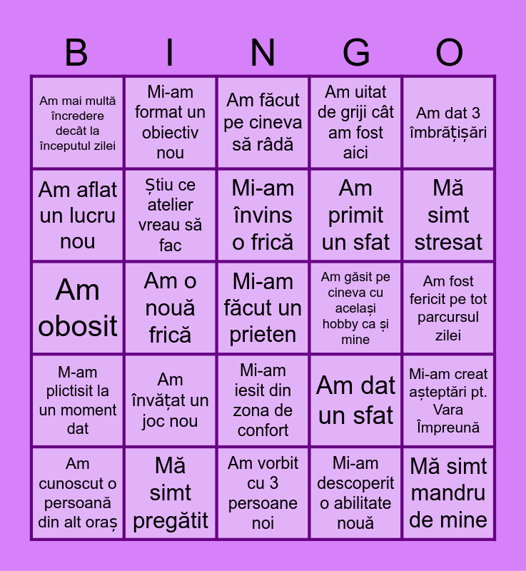This bingo card has 25 words: Am învățat un joc nou, Am vorbit cu 3 persoane noi, Mi-am învins o frică, Am cunoscut o persoană din alt oraș, Am dat 3 îmbrățișări, Am mai multă încredere decât la începutul zilei, Am aflat un lucru nou, Mi-am format un obiectiv nou, Am găsit pe cineva cu același hobby ca și mine, Mi-am iesit din zona de confort, Am primit un sfat, Am obosit, Am dat un sfat, Mi-am creat așteptări pt. Vara Împreună, Știu ce atelier vreau să fac, Mă simt mandru de mine, Am fost fericit pe tot parcursul zilei, Am făcut pe cineva să râdă, Mă simt stresat, Am o nouă frică, Mi-am făcut un prieten, Mă simt pregătit, M-am plictisit la un moment dat, Am uitat de griji cât am fost aici and Mi-am descoperit o abilitate nouă.