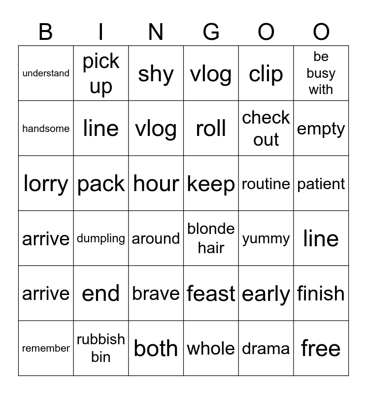 This bingo card has 42 words: drama, line, nurse, routine, line, dumpling, lorry, record, shy, patient, hour, roll, empty, clip, rubbish bin, arrive, finish, check out, free, pick up, be busy with, brave, arrive, understand, ridiculous, remember, vlog, boring, end, early, look like, keep, handsome, yummy, both, around, blonde hair, pack, feast, whole, vlog and remember.