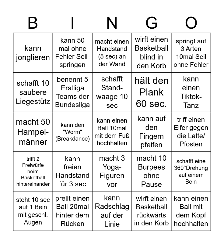 This bingo card has 25 words: kann freien Handstand für 3 sec, kann Radschlag auf der Linie, schafft Stand-waage 10 sec, steht 10 sec auf 1 Bein mit geschl. Augen, springt auf 3 Arten 10mal Seil ohne Fehler, kann jonglieren, schafft 10 saubere Liegestütz, kann 50 mal ohne Fehler Seil-springen, kann auf den Fingern pfeifen, macht 3 Yoga-Figuren vor, hält den Plank 60 sec., macht 50 Hampel-männer, macht 10 Burpees ohne Pause, schafft eine 360°Drehung auf einem Bein, benennt 5 Erstliga Teams der Bundesliga, kann einen Ball mit dem Kopf hochhalten, triff einen Elfer gegen die Latte/ Pfosten, macht einen Handstand (5 sec) an der Wand, kann einen Tiktok-Tanz, kann den "Worm" (Breakdance), kann einen Ball 10mal mit dem Fuß hochhalten, prellt einen Ball 20mal hinter dem Rücken, trifft 2 Freiwürfe beim Basketball hintereinander, wirft einen Basketball blind in den Korb and wirft einen Basketball rückwärts in den Korb.