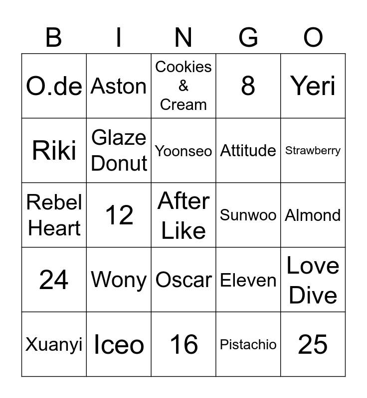 This bingo card has a free space and 24 words: Wony, Iceo, Yoonseo, Xuanyi, Yeri, O.de, Riki, Aston, Sunwoo, Oscar, Attitude, Rebel Heart, Eleven, Love Dive, Glaze Donut, Pistachio, Almond, Cookies & Cream, Strawberry, 12, 25, 24, 8 and 16.