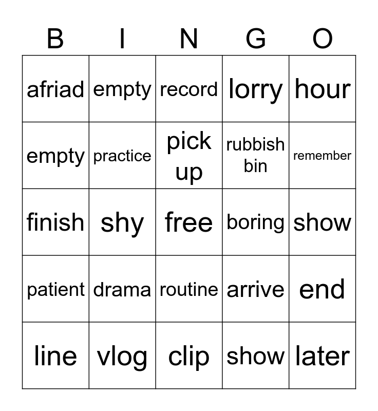 This bingo card has a free space and 29 words: line, understand, shy, brave, afriad, record, practice, drama, boring, vlog, show, later, clip, show, remember, nurse, routine, patient, hour, finish, arrive, be busy with, rubbish bin, empty, lorry, empty, end, pick up and early.
