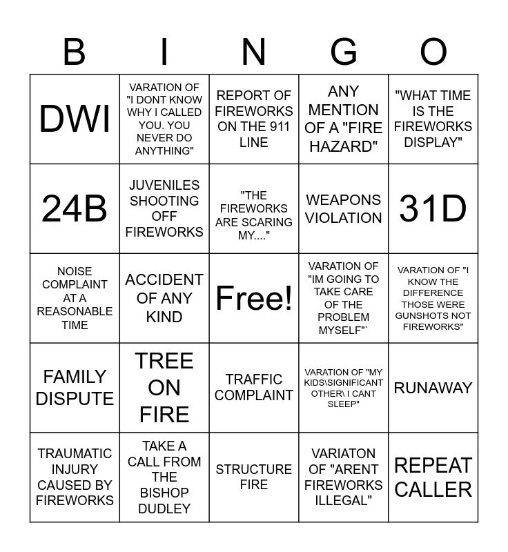 This bingo card has a free space and 34 words: INTOXICATED SUBJECT, VARIATON OF "ARENT FIREWORKS ILLEGAL", LOST\FOUND DOG, VEHICLE FIRE, FAMILY DISPUTE, JUVENILES SHOOTING OFF FIREWORKS, "WHAT TIME IS THE FIREWORKS DISPLAY", TRAUMATIC INJURY CAUSED BY FIREWORKS, VARATION OF "I DONT KNOW WHY I CALLED YOU. YOU NEVER DO ANYTHING", LOST CHILD, "THE FIREWORKS ARE SCARING MY....", REPORT OF FIREWORKS ON THE 911 LINE, SERGEANT LANDLINE\ CITIZEN COMPLAINT, VARATION OF "THE FIREWORKS ARE TRIGGERING MY PTSD\ANXIETY", VARATION OF "IM GOING TO TAKE CARE OF THE PROBLEM MYSELF"`, 31D, TAKE A CALL FROM THE BISHOP DUDLEY, NOISE COMPLAINT AT A REASONABLE TIME, TREE ON FIRE, VARATION OF "MY KIDS\SIGNIFICANT OTHER\ I CANT SLEEP", TRAFFIC COMPLAINT, VARATION OF "I'M A TAX PAYER\PAYING SALARIES", DWI, VARATION OF "I KNOW THE DIFFERENCE THOSE WERE GUNSHOTS NOT FIREWORKS", STRUCTURE FIRE, REPEAT CALLER, ANY MENTION OF A "FIRE HAZARD", MAN DOWN, WEAPONS VIOLATION, 24B, NEIGHBOR DISPUTE, ACCIDENT OF ANY KIND, RUNAWAY and ASSAULT.
