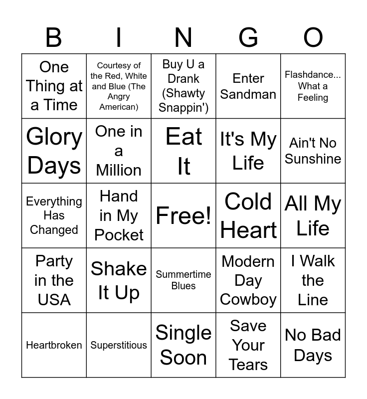 This bingo card has a free space and 56 words: Shoop, Heartbroken, Black and Yellow, One Thing at a Time, Single Soon, Independence Day, One in a Million, She's a Beauty, It's My Life, Texas Flood, Enter Sandman, Give It to Me Baby, DJ Got Us Fallin' in Love, Santeria, Believe, Better Days (And the Bottom Drops Out), Flashdance... What a Feeling, Hand in My Pocket, I'm with You, No Bad Days, Cold Heart, Fever, Modern Day Cowboy, Buy U a Drank (Shawty Snappin'), Heart Shaped Box, Eat It, Flying High Again, Bones, Ain't No Sunshine, Only Girl (In the World), God's Plan, Enola Gay, Girls Like You, Where Did Our Love Go, All My Life, Glory Days, Everything Has Changed, Take It On the Run, Party in the USA, Courtesy of the Red, White and Blue (The Angry American), Summertime Blues, A Beautiful Lie, (I Just) Died in Your Arms, Wanted Dead or Alive, I Am, Shake It Up, Superstitious, American Woman, When I See U, Leave Before You Love Me, Save Your Tears, Chemical, Lovesick, Blame Brett, I Walk the Line and Living in America.